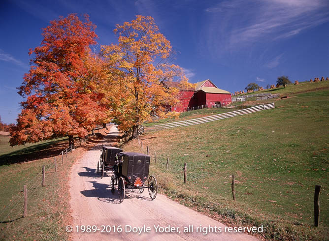 Becks Mills, Holmes Co. Ohio Buggy coming up road with bright colored trees and white barn behind