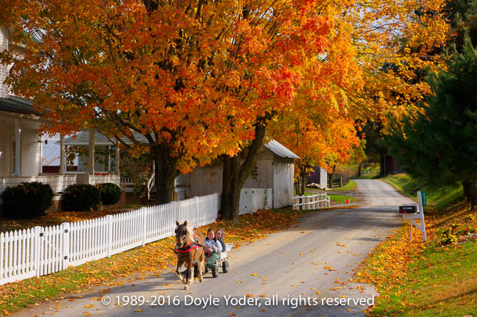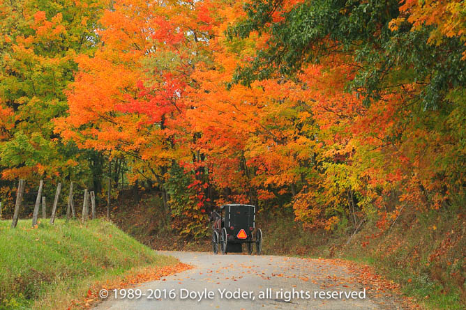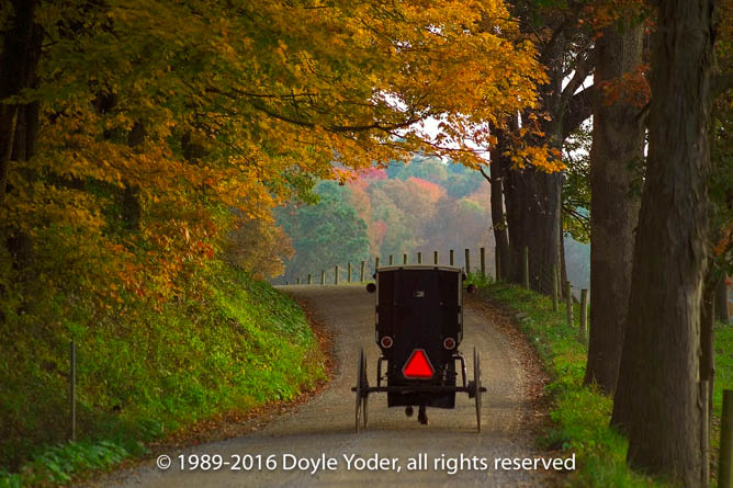 New Bedford, Holmes Co. Ohio Buggy coming up road through woods lined with bright yellow trees