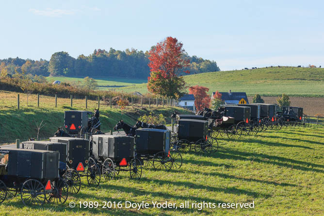 Long line of Buggies coming up road from wedding with farm in valley behind