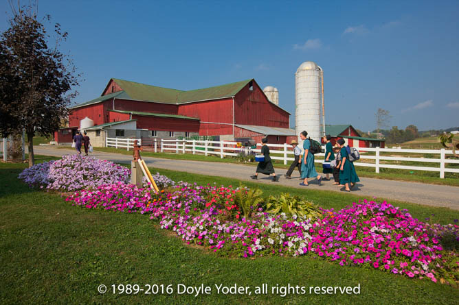 Becks Mills, Holmes Co. Ohio Children walking home from school coming up road with bright colored trees and white barn behind