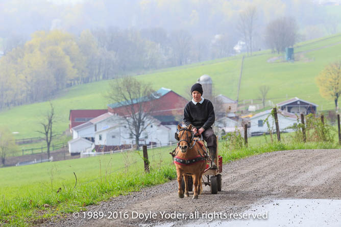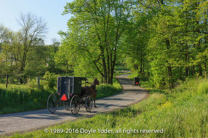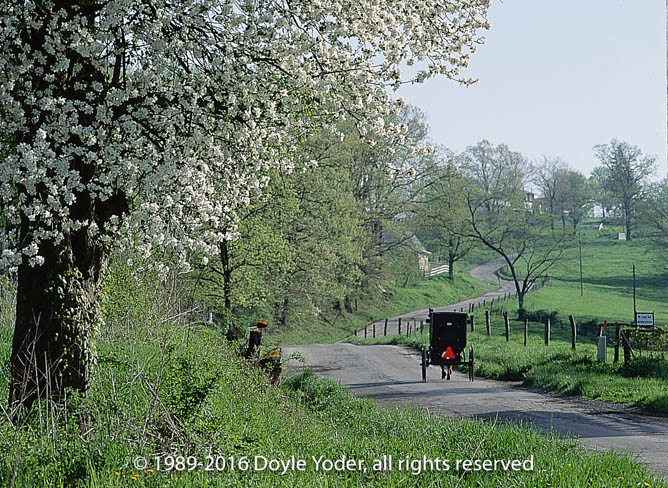 Berlin, Holmes Co. Ohio Buggy coming up road beside blooming trees with storm clouds behind