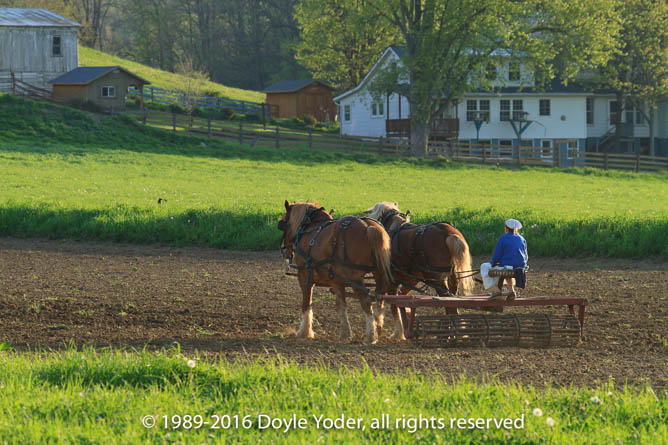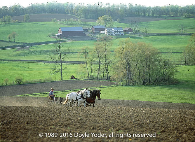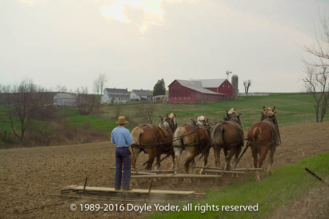 Mt Hope, Holmes Co. Ohio Team of five horses pulling spring harrow and team of two horses pulling corn planter in field behind wagon