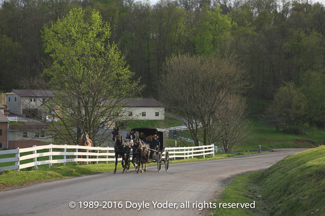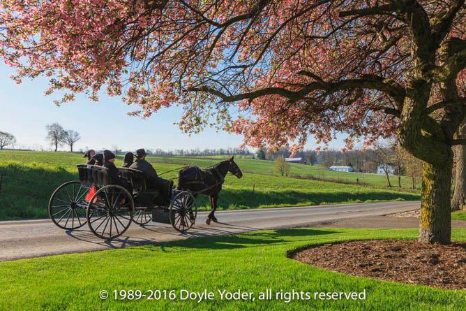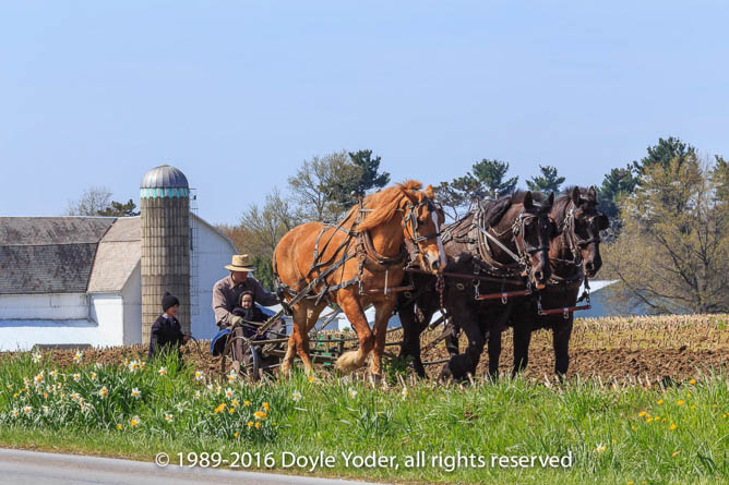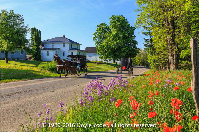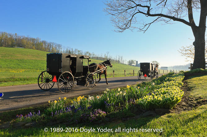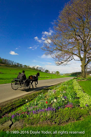 Millersburg, Holmes Co. Ohio Daffodils in flower garden with buggy going past on road