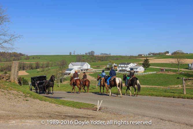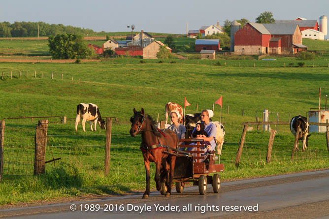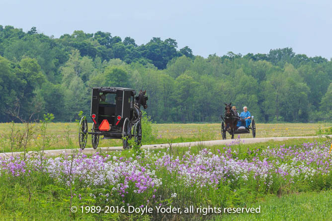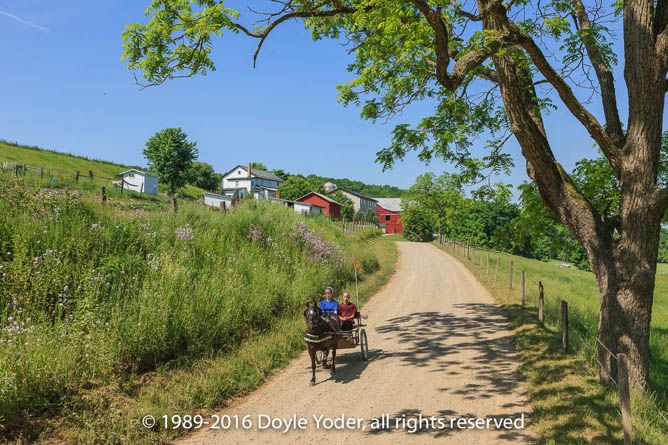 Shreve, Holmes Co. Ohio Buggy going away on road and people walking past flowers and lilac bush towards farm house to church