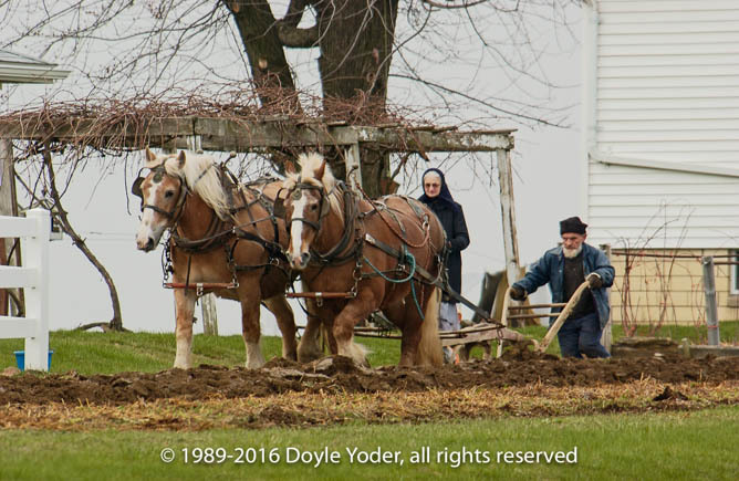 Bunker Hill, Holmes Co. Ohio Team of two Belgian horses pulling walking plow with man and woman in garden
