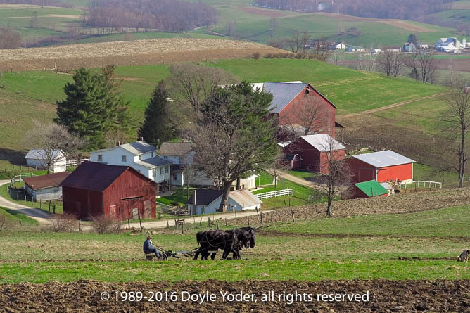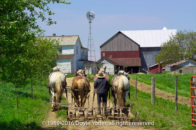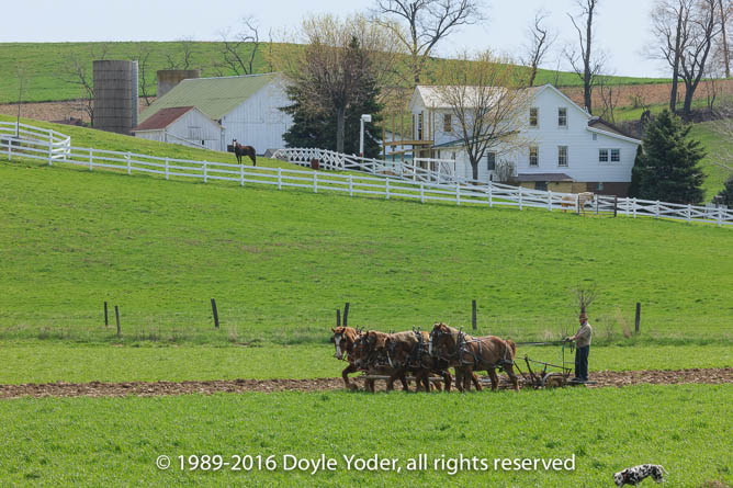 Walnut Creek, Holmes Co. Ohio Team of four Belgian and team of four Perchron horses pulling riding plow in fields with cows in field farm houses and white barn behind