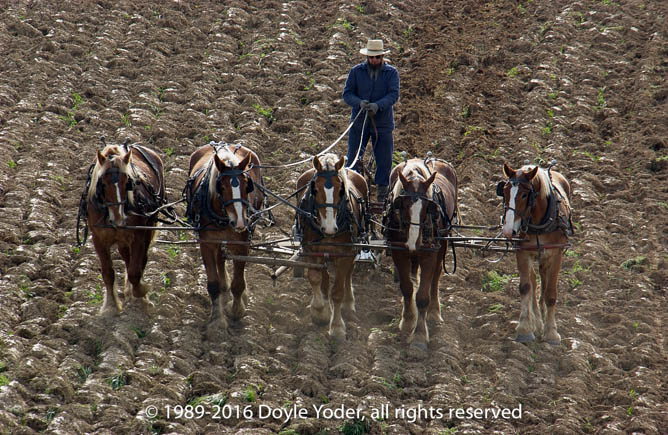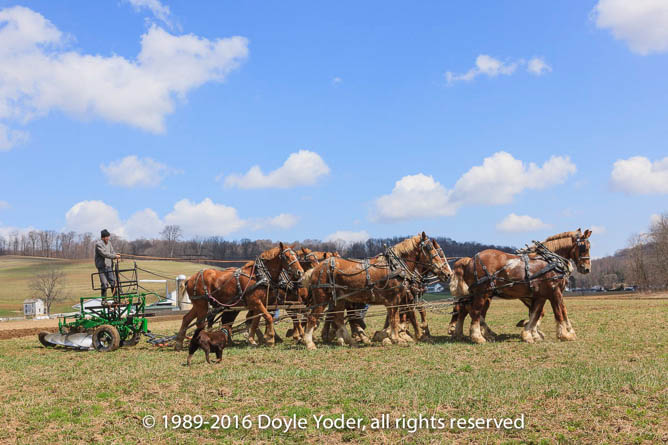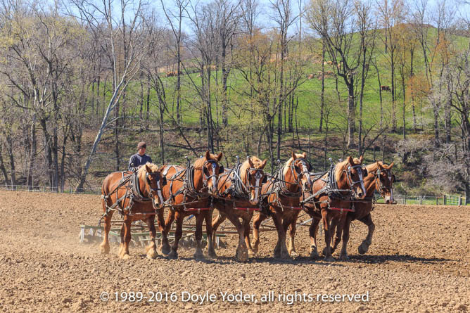 Mt Hope, Holmes Co. Ohio Team of six Belgian horses pulling riding plow in field