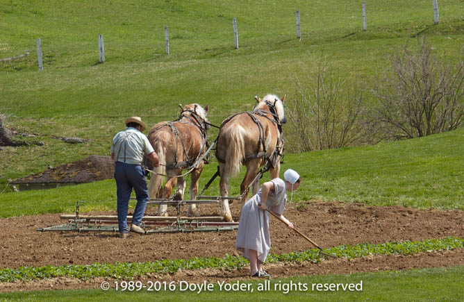 Holmesville, Holmes Co. Ohio Team of two Belgian horses pulling walking harrow in garden with woman raking garden