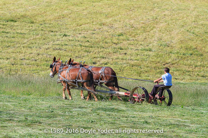 Becks Mills, Holmes Co. Ohio Five teams of horses pulling hay mowers in field