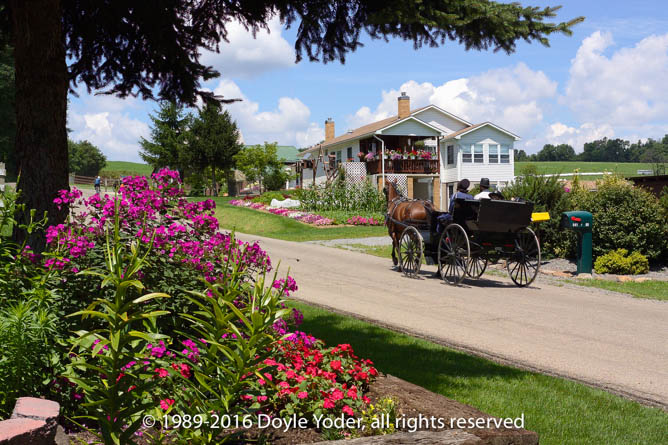 Charm, Holmes Co. Ohio Flower garden with farm house behind buggy going past on road