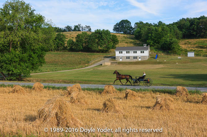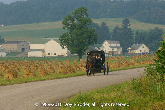 big white barn behind field full of wheat shocks, hack with milk cans on going away up lane