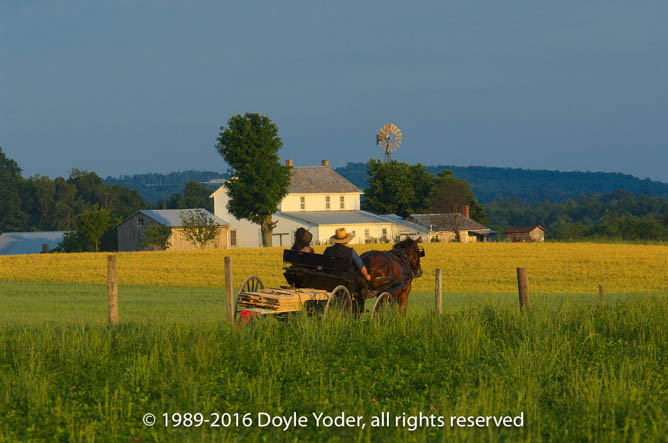 Mt Hope, Holmes Co. Ohio Buggy going away on road with moon and windmill behind