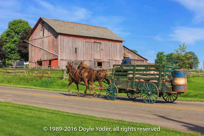 Ura D Miller roadcart going past Set Dannys flowers with white barn behind