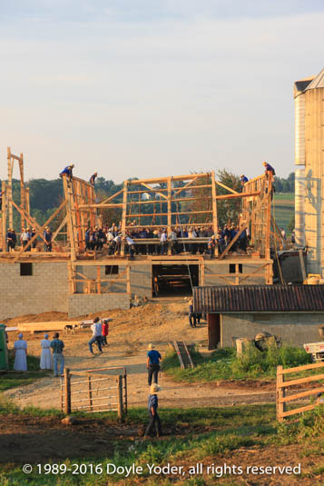 barn raising at Wayne Burkholder farm early in the morning with just a few walls up