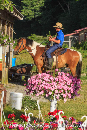 Maysville, Wayne, Co. Ohio Boy riding pony with sunset behind