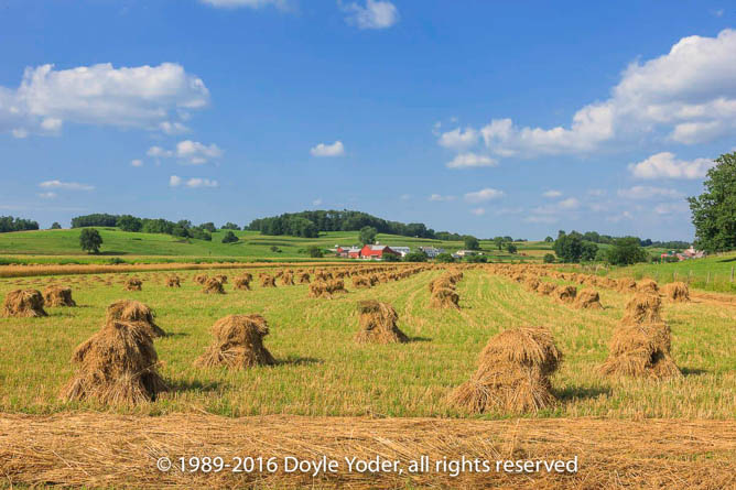 Kidron, Wayne Co. Ohio Oat shocks in front of farm house and red barn