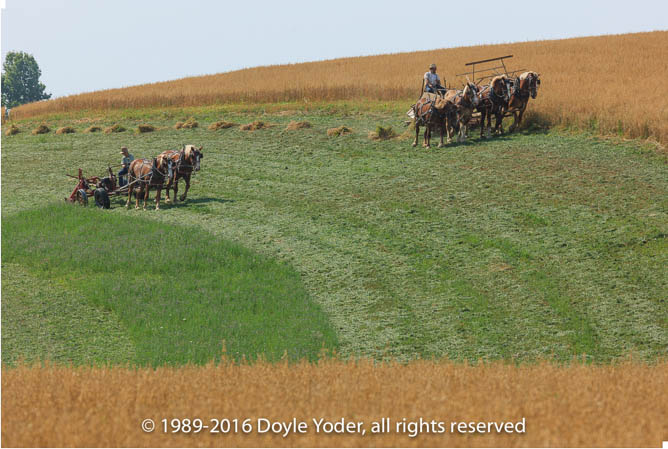 Farmerstown, Holmes Co. Ohio team of four belgian horses pulling grain drill with team of two belgian horses pulling hay rake