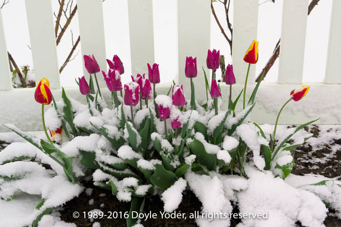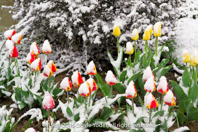 Berlin, Holmes Co. Ohio Spring snow with tulips in flower garden covered with snow
