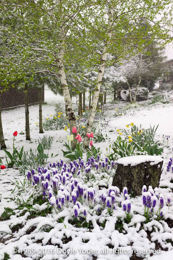 Mt Hope, Holmes Co. Ohio Spring snow with tulips and flowers in garden covered with snow