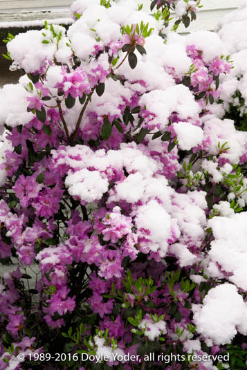 Mt Hope, Holmes Co. Ohio Spring snow with blooms on bush covered with snow